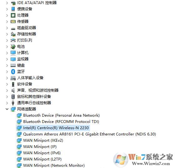 2、在設(shè)備管理器中,展開網(wǎng)絡(luò)適配器,查看并確保無線網(wǎng)卡在啟動(dòng)狀態(tài)(沒有被禁用),能夠看到wireless選項(xiàng)(就是無線網(wǎng)卡)。