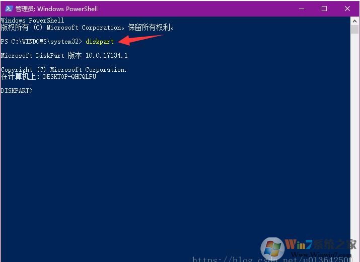 2、打開Windows PowerShell之后,我們要使用 Diskpart磁盤工具了,輸入Diskpart 回車。