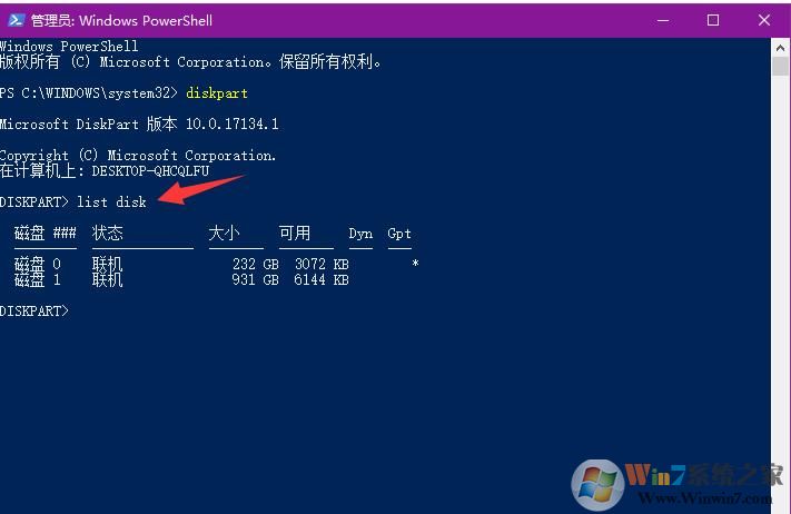 3、輸入 list disk 回車。這個命令為顯示你的所有硬盤;
