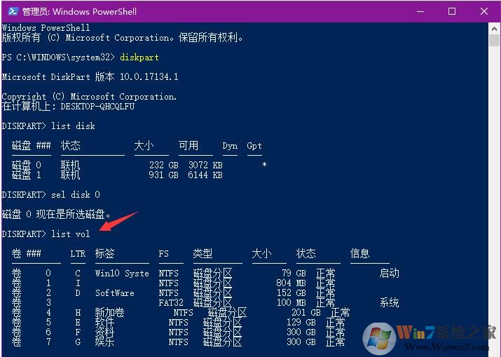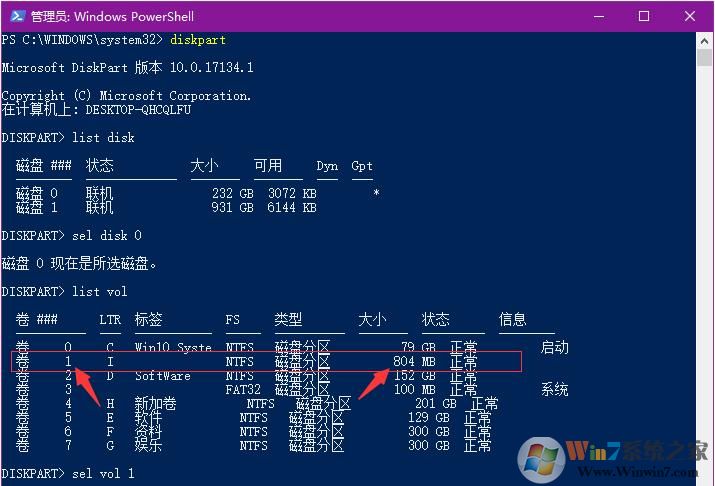 6、根據(jù)磁盤大小,我們可以找到那個多出來的卷,然后記住前面的數(shù)字,我這里是1,于是輸入 sel vol 1 回車。