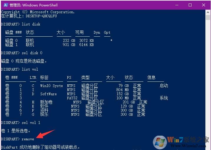 7、輸入 remove 回車。該命令為卸載磁盤,也就是刪除盤符了。