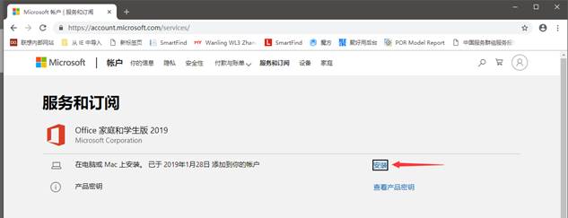四、接下來點擊“管理訂閱”,就可以看到“安裝”選項。我們點擊這個就可以開始Office2019家庭版和學(xué)生版的安裝步驟了。