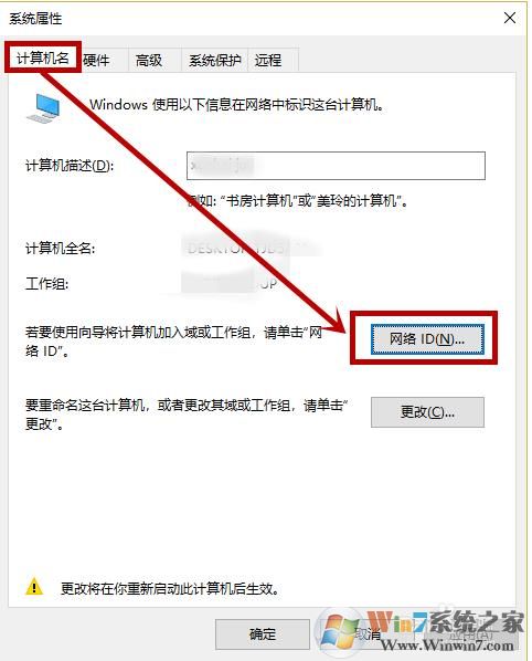 3、出現(xiàn)計(jì)算機(jī)名后,點(diǎn)擊“網(wǎng)絡(luò)ID”按鈕;