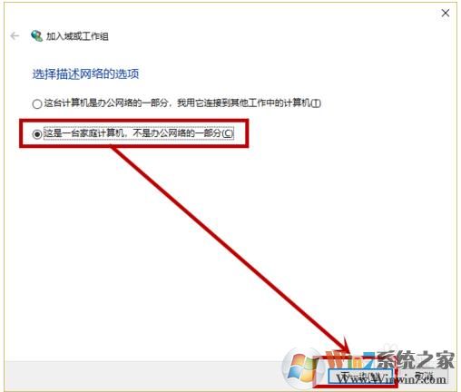 4、然后我們把原來的這臺(tái)計(jì)算機(jī)是辦公網(wǎng)絡(luò)的一部分設(shè)置為,這是一臺(tái)家庭計(jì)算機(jī),不是辦公網(wǎng)絡(luò)的一部分;
