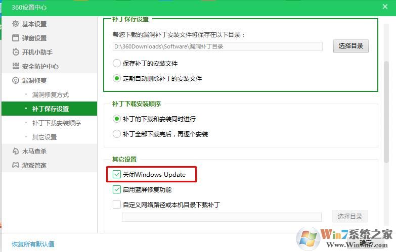 如果不行,看看電腦上是否安裝了360安全衛(wèi)士,在設(shè)置 漏洞修復(fù)中,取消勾選 關(guān)閉Windows update
