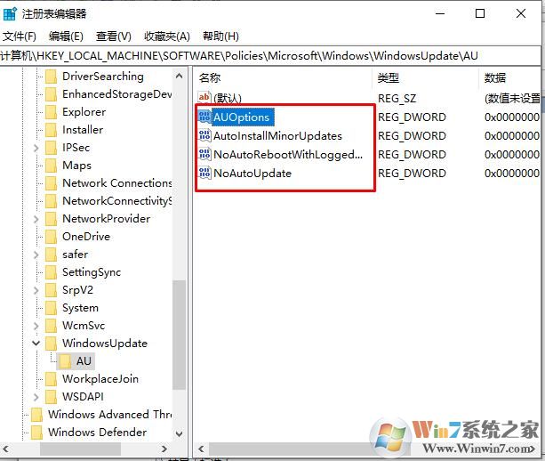 2、來到路徑: [HKEY_LOCAL_MACHINE\SOFTWARE\Policies\Microsoft\Windows\WindowsUpdate\AU]