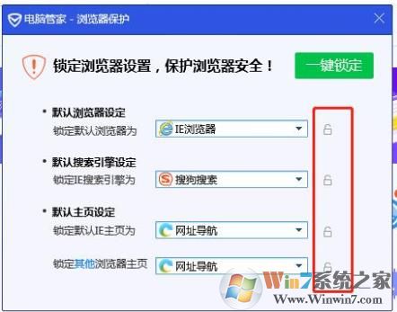 4、點(diǎn)擊右側(cè)的向下的箭頭可以選擇相應(yīng)的設(shè)置,右邊的鎖都會(huì)鎖的狀態(tài)時(shí)就鎖定完成了。QQ電腦管家可以鎖定的項(xiàng)目有:默認(rèn)瀏覽器、IE默認(rèn)搜索引擎、IE主頁、其它瀏覽器主頁