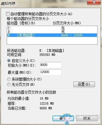 因為我的游戲是裝在E盤里的所以我設(shè)置了E盤的虛擬內(nèi)存,我是8g內(nèi)存,初始值我設(shè)置的9000-最大值設(shè)置的12000