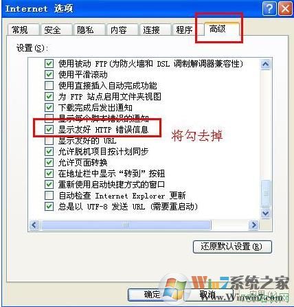 在IE瀏覽器下點(diǎn)擊 工具-internet選項(xiàng)-高級(jí),滾動(dòng)條拉到最后,將“顯示友好HTTP錯(cuò)誤信息”前的勾去掉,確定,這時(shí)刷新“500內(nèi)部服務(wù)器錯(cuò)誤”頁(yè)面,或者重新啟動(dòng)該頁(yè)面,頁(yè)面便會(huì)彈出新的報(bào)錯(cuò)項(xiàng)目,這是網(wǎng)頁(yè)報(bào)錯(cuò)的信息便會(huì)告訴你是原因?qū)е麓隋e(cuò)誤發(fā)生。