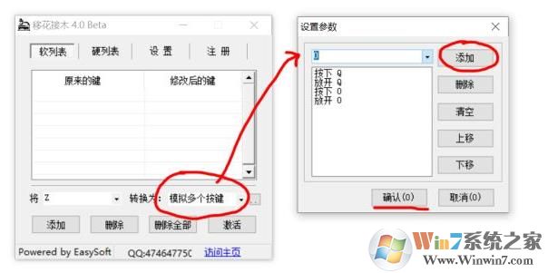 點擊右邊的輸入框,在下拉菜單找到“模擬多個按鍵”。會彈出一個窗口,你輸入Q,點擊添加,再輸入O,點擊添加。最后點擊確認,激活后即可生效。Win7系統(tǒng)之家 m.cncxm.com