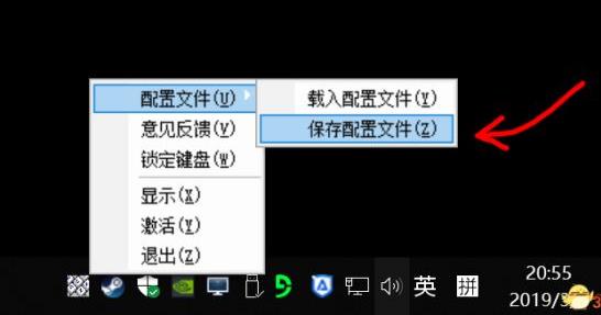 在你電腦桌面的右下角托盤,找到軟件的圖標(biāo),用右鍵單擊,在彈出的菜單選擇:配置文件—保存配置文件。