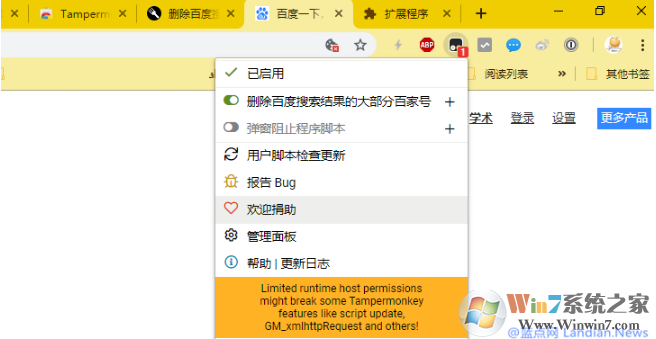 成功安裝后瀏覽器不會看到任何變化不過打開百度就可以看到右上角角標(biāo)顯示1,代表此頁面已啟用1個腳本。