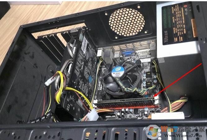 1、首先打開臺式電腦的側(cè)面板,我們就可以看到機身內(nèi)部了,箭頭所指就是內(nèi)存條了。