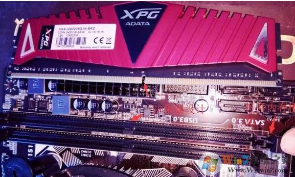 對準插入內(nèi)存條并下壓,并檢查內(nèi)存條兩邊的卡扣固定情況,一定要到位,并且扣住!