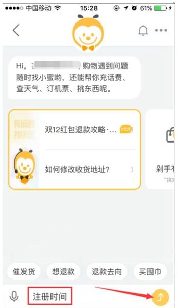 3、在打字欄里輸入“注冊時(shí)間”或者淘齡,點(diǎn)擊發(fā)送按鈕;