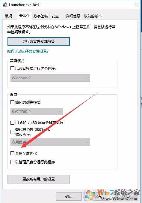 2、然后在屬性—兼容性這一項(xiàng)下,我們可以看到下面的 禁用全屏優(yōu)化,勾選后—應(yīng)用,就可以了。