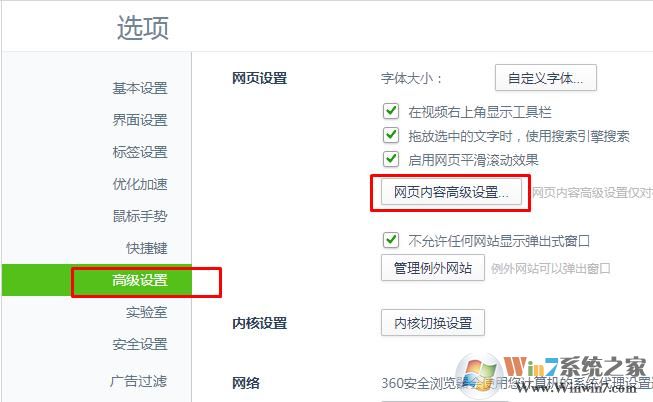2、找到左側的高級設置,然后在右邊找到“內容高級設置”按鈕,點擊;