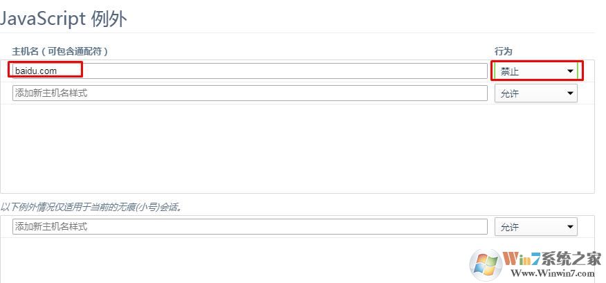 4、主機名這里添加網站域名,行為設置為禁止;這樣baidu這個域名就禁用js腳本了。