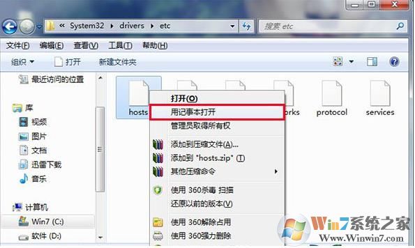 3、找到hosts文件并右擊。待看到彈出的選項(xiàng)選中“用記事本打開”。