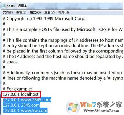 4、在hosts記事本文件中把“For example:”下第一個(gè)參數(shù)值留下,后面的全部刪除,然后按快捷鍵ctrl+s保存文件。