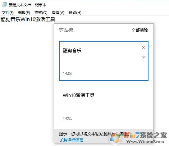 如上示例:分別復(fù)制了Win10激活工具(文字)和、酷狗音樂(文字),點(diǎn)擊后可選擇其中一個(gè)進(jìn)行粘貼,同時(shí)也有復(fù)制的時(shí)間方便用戶選擇。