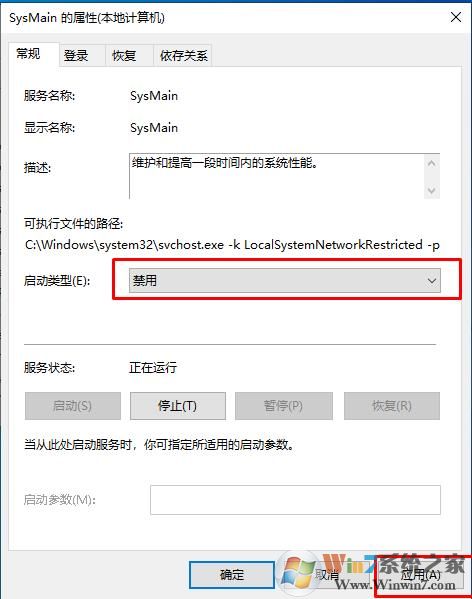 3、把sysmain服務(wù)啟動類型設(shè)置為禁用,然后點擊應(yīng)用保存