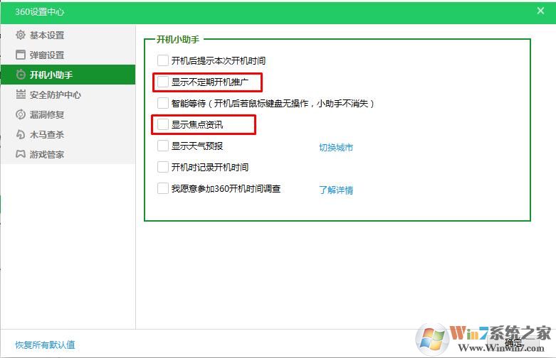 3、如果不希望開(kāi)機(jī)時(shí)彈出焦點(diǎn)資訊,那么可以在開(kāi)機(jī)小助手里,取消勾選 “顯示不定期開(kāi)機(jī)推廣、顯示焦點(diǎn)資訊”兩項(xiàng)