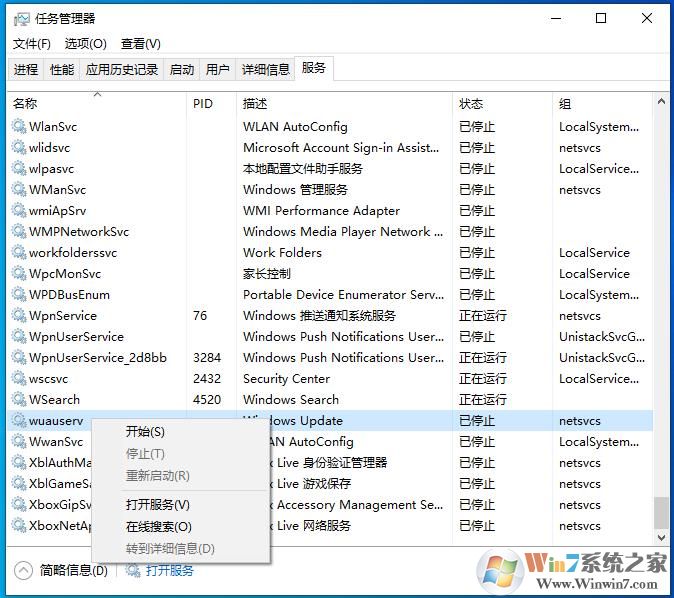 步驟2:暫停Windows Update服務(wù)。啟動任務(wù)管理器(右鍵任務(wù)欄》任務(wù)管理器),點擊服務(wù)頁面,右鍵wuauserv然后點擊停止。此外對BITS服務(wù)執(zhí)行相同操作。