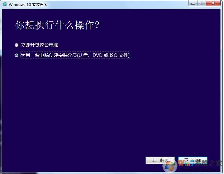4、選擇為另一臺電腦創(chuàng)建安裝介質(zhì),U盤,DVD,ISO,下一步;