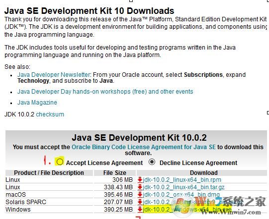 2、如下圖,選擇接受協(xié)議,點(diǎn)擊黃色標(biāo)注的64位10.0.2版本jdk進(jìn)行下載: