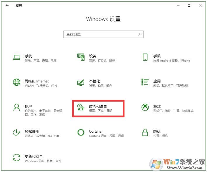 1. 首先按組合鍵“windows徽標(biāo)鍵(也就是開始菜單鍵)+I”打開設(shè)置,點(diǎn)擊其中的“時(shí)間和語言”: