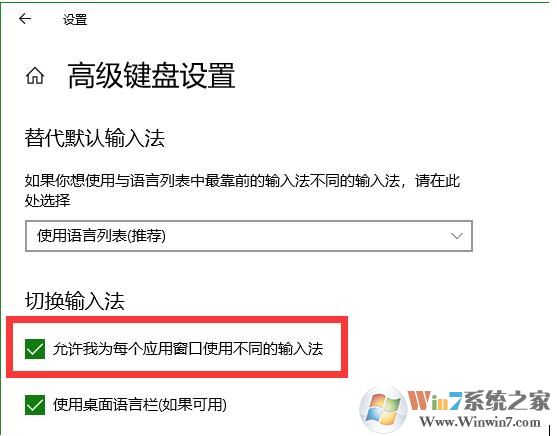 4. 這里我們可以看到有一個(gè)“允許我為每個(gè)應(yīng)用窗口使用不同的輸入法”選項(xiàng),在前面的復(fù)選框打鉤,即可開啟這項(xiàng)功能:
