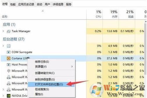 打開資源管理器,找到“Cortana(小娜)”進(jìn)程,在該進(jìn)程上點擊鼠標(biāo)右鍵,選擇“打開文件所在位置”