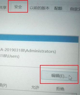 2、在屬性界面內(nèi)找到”安全“選項并單擊,再在”安全“選項界面內(nèi)找到”編輯“選項并單擊;