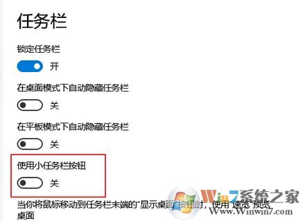 3、此時我們在右側(cè)看一下您是否開啟了 “使用小任務(wù)欄按鈕” 的選項,如果開啟了,將此選項關(guān)閉,看一下能否解決此問題,如圖: