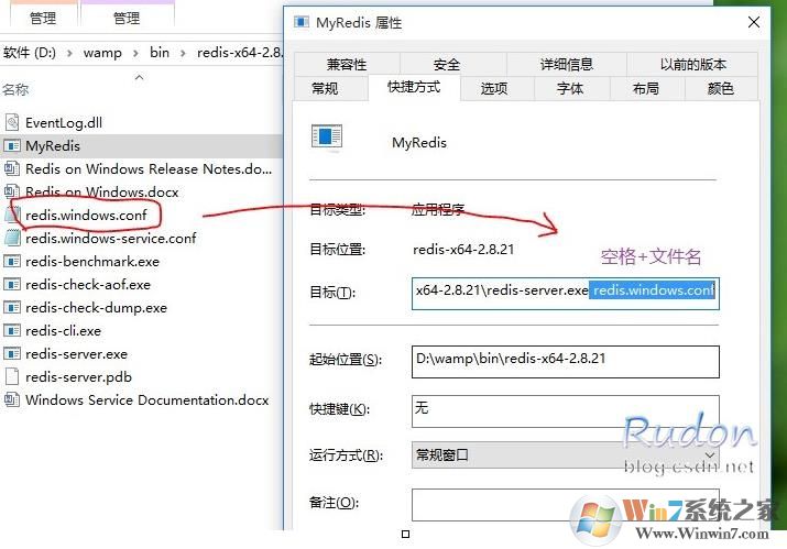 4、右鍵點擊MyRedis——屬性,然后在目標屬性外,添加并指定讀取的配置文件redis.windows.conf,前面要加空格(如)