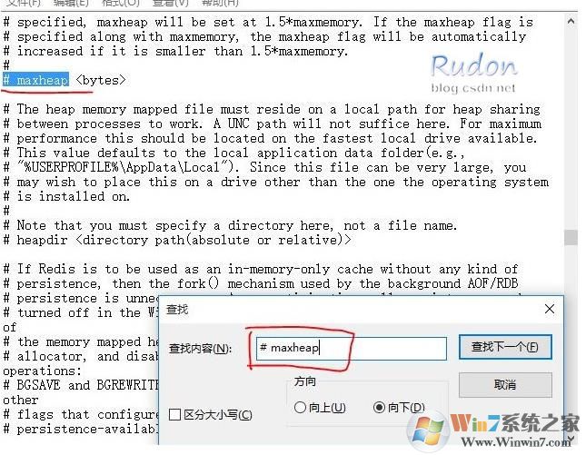 5、修改redis.windows.conf,在文件對應位置 添加兩個設置:maxheap 4294967296 和 heapdir D:\MyRedisSwap\ (見圖示)