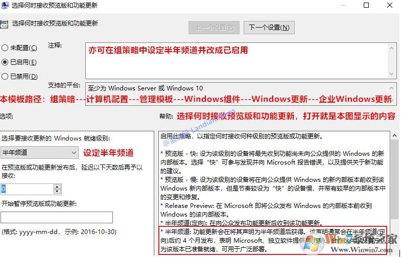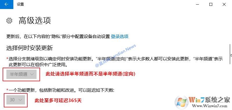 對于非家庭版用戶亦可在系統(tǒng)更新的高級選項(xiàng)中將分支版本切換為半年頻道,切換后即延遲4 個月后再更新。其中功能更新也就是重大版本更新還可以手動延遲最高 65天, 因此設(shè)置后可以妥妥滴始終禁止系統(tǒng)再更新。請注意:此處必須設(shè)置為半年頻道而不是半年頻道(定向), 所謂定向也就是重大版本發(fā)布立即進(jìn)行自動更新。我們的目的是延遲更新所以不能設(shè)置為定向的半年頻道,本設(shè)置在本地組策略編輯中將會有詳細(xì)的說明解釋。