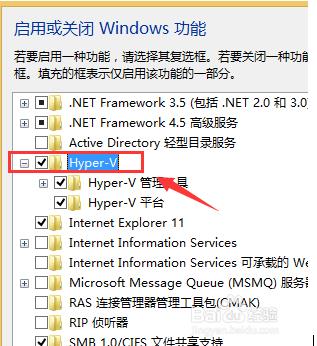 3、在啟用windows或關閉windows功能中,取消勾選“Hyper-V”,然后確定保存。