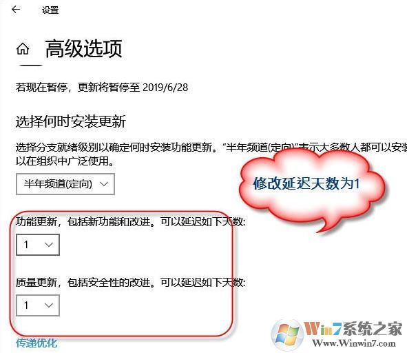 3、在高級選項(xiàng)中把功能更新,包括新功能和改進(jìn),延遲天數(shù)改成1天,下面質(zhì)量更新也改成1天。