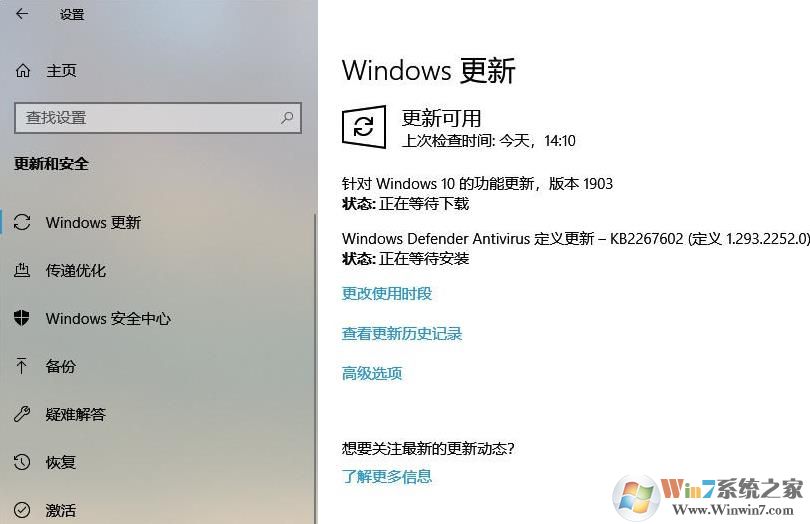 4、然后回到windows更新下,檢查更新,此時(shí)可以發(fā)現(xiàn)可以檢測到Win10 1903更新,升級即可。