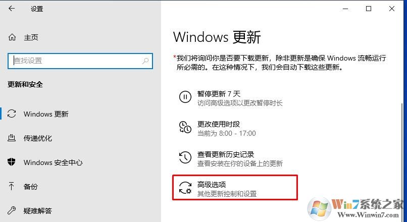 2、在Windows更新中,點(diǎn)擊高級選項(xiàng),如下圖