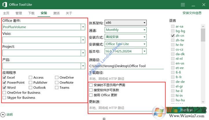 使用 Office Tool Lite 配置一個(gè)顯示 UI 界面的 Microsoft Office 2016 批量授權(quán)版的安裝,其配置結(jié)果如下。