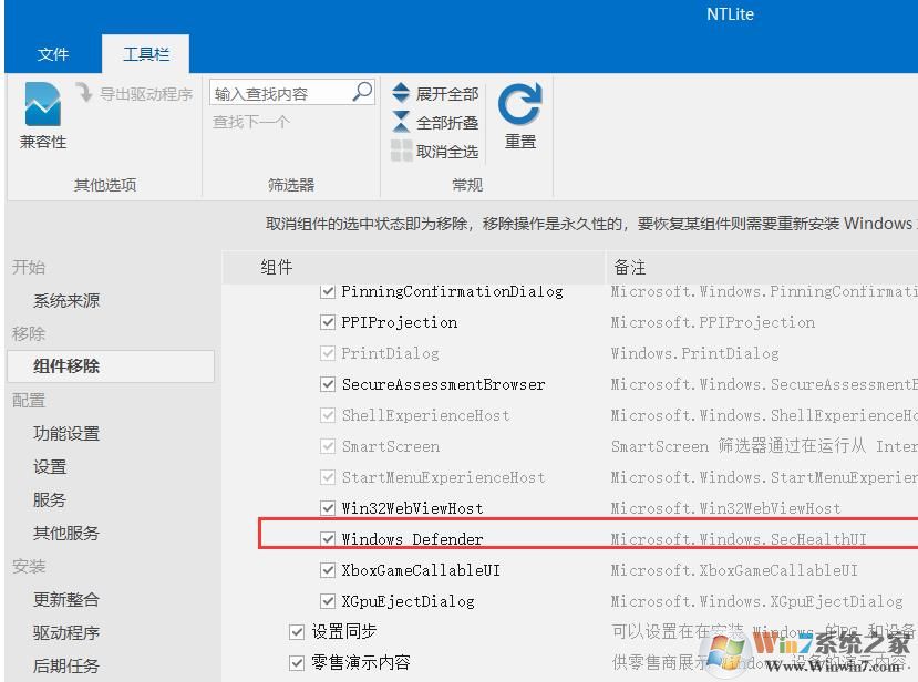 2、好了,這時我們可以看到Windows Defender這個功能了,去掉勾選就可以了。