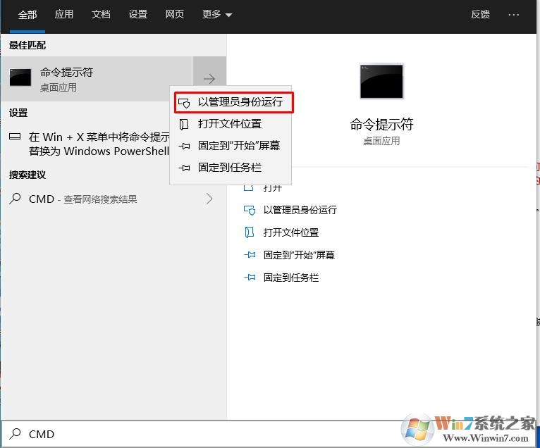 1、首先在搜索里輸入CMD,然后右鍵以管理員身份打開;