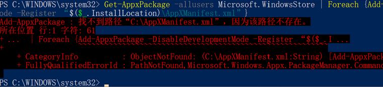 在設(shè)置-> 應(yīng)用和功能 里面沒有 應(yīng)用商店,而且在powershell中以管理員模式執(zhí)行了: