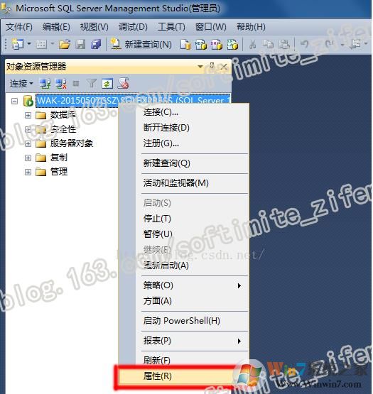 2. 在管理中,右鍵數(shù)據(jù)庫(kù)服務(wù)器名,選擇【屬性】。