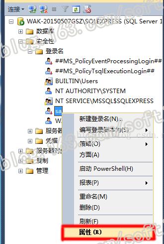 4. 展開數(shù)據(jù)庫(kù)服務(wù)器名—“安全性”—“登錄名”, 右鍵“sa”用戶,選擇【屬性】。