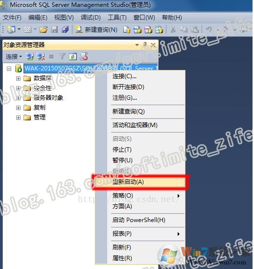 7. 右鍵數(shù)據(jù)庫(kù)服務(wù)器名,選擇【重新啟動(dòng)】,重啟SQL Server 2014