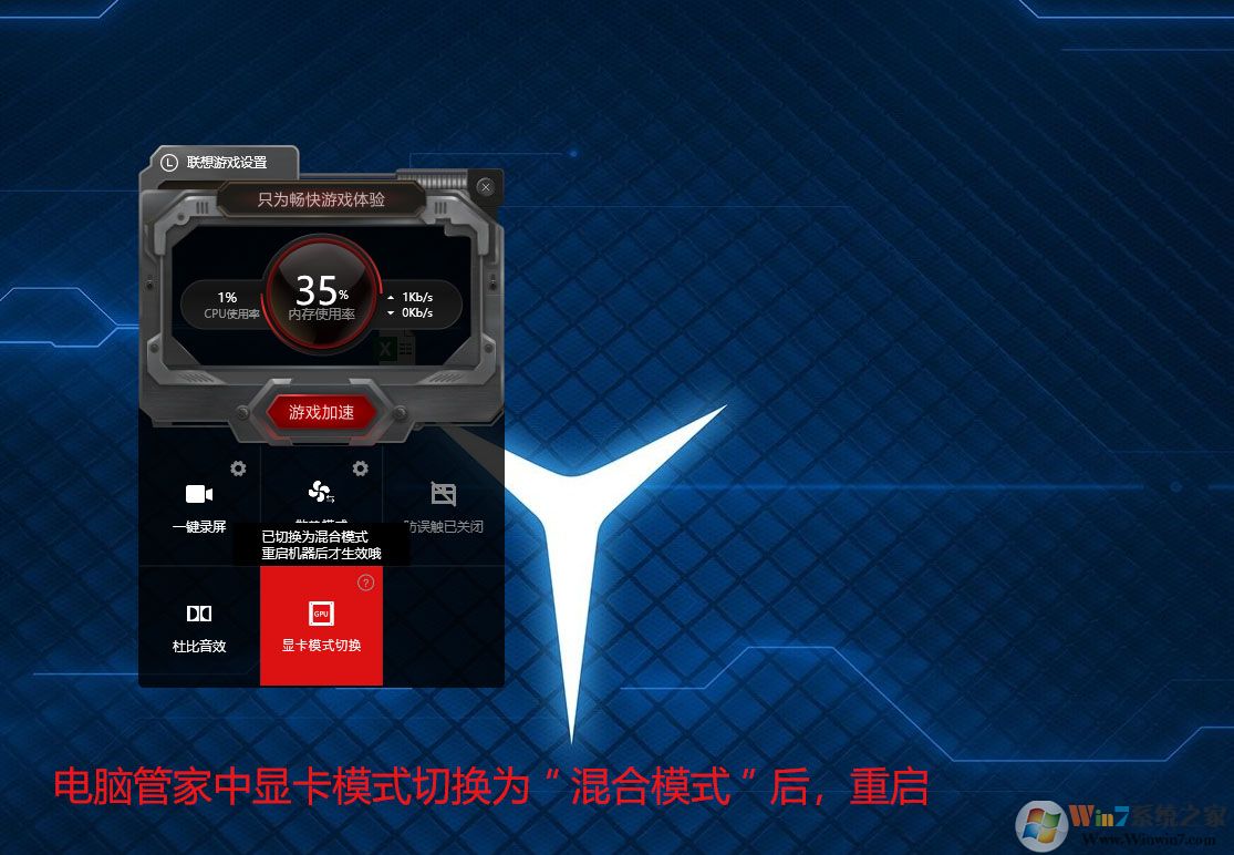 1. 打開(kāi)聯(lián)想游戲設(shè)置,此時(shí)的默認(rèn)模式為獨(dú)顯輸出: